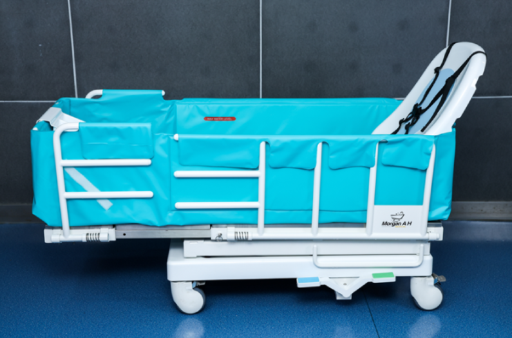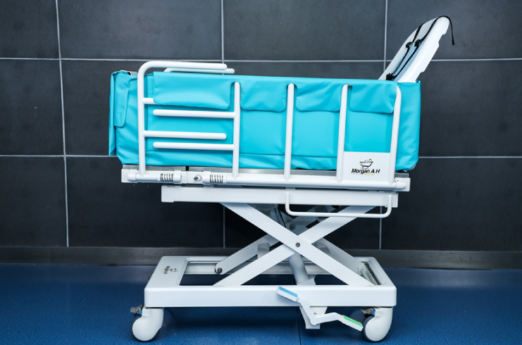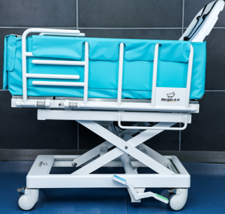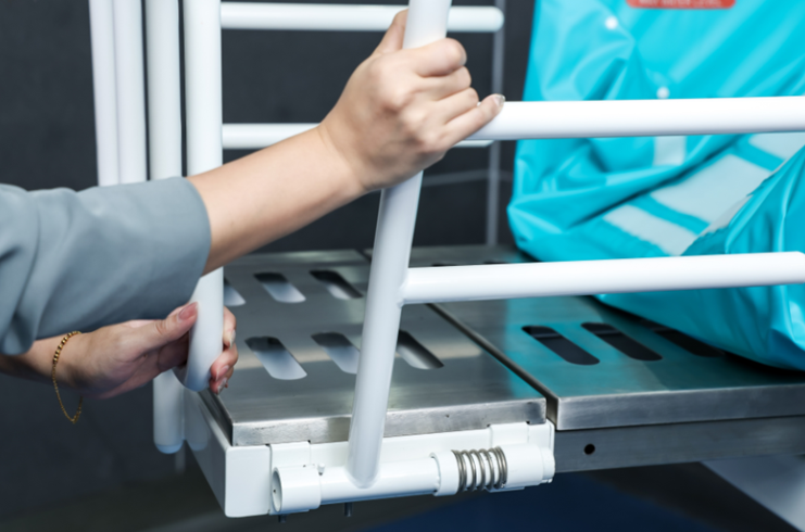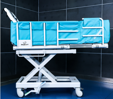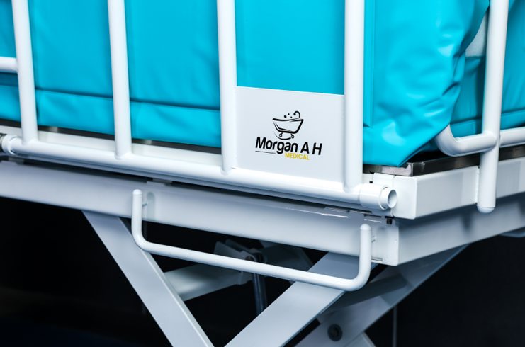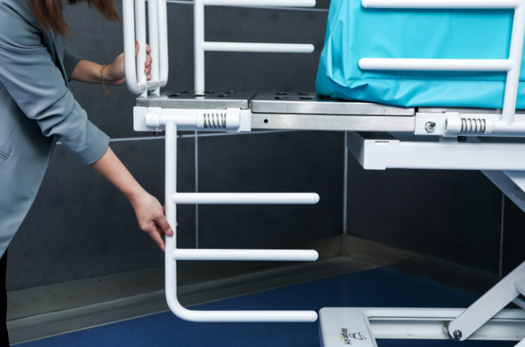Our tub is equipped with security pull pins that make it easy to lower the railings and transfer the patient from the bed